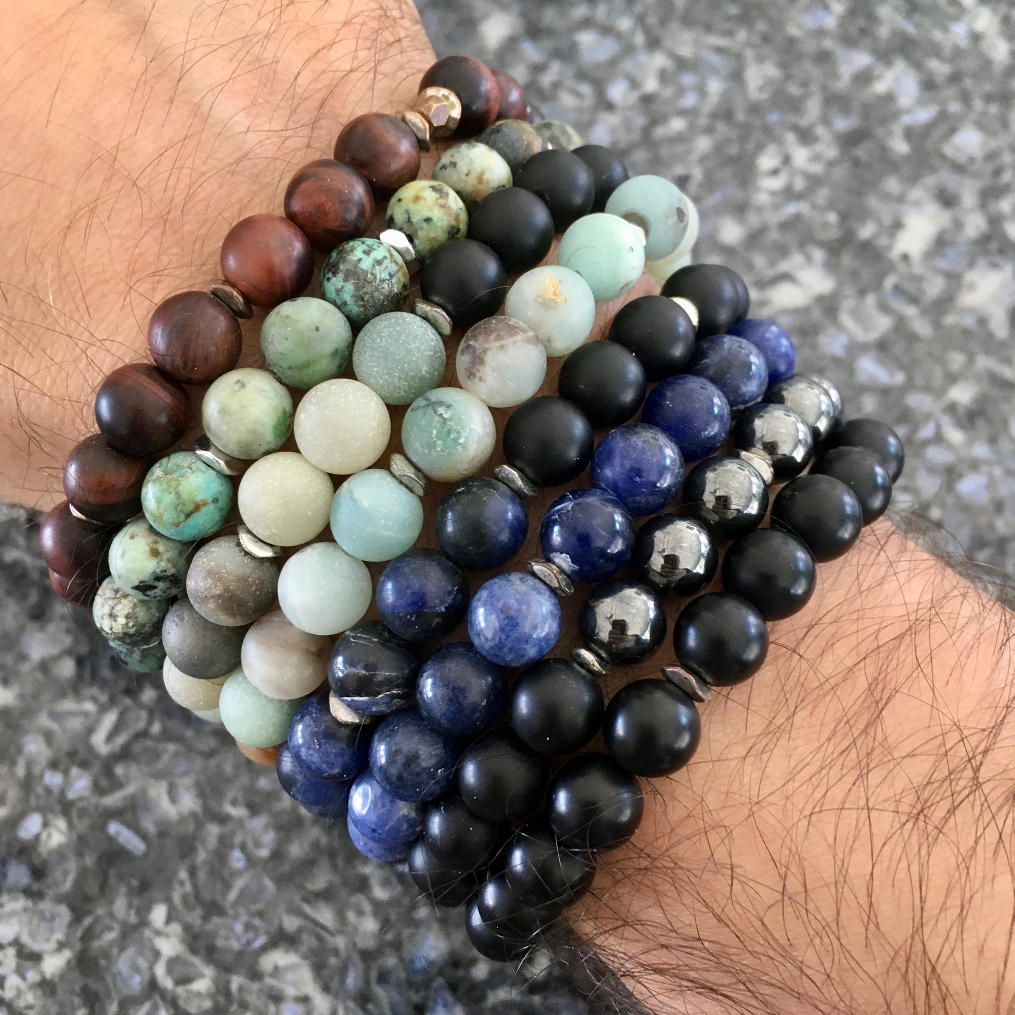 Available in four sizes; 7", 7.5", 8' and 8.5" in eight different color options, all of which look great together. Stones are a matte finish but will develop a shine over years of wear. The metal spacer beads are non-reactive 100% nickel free brass. You can even shower and swim in these, no trouble at all.
