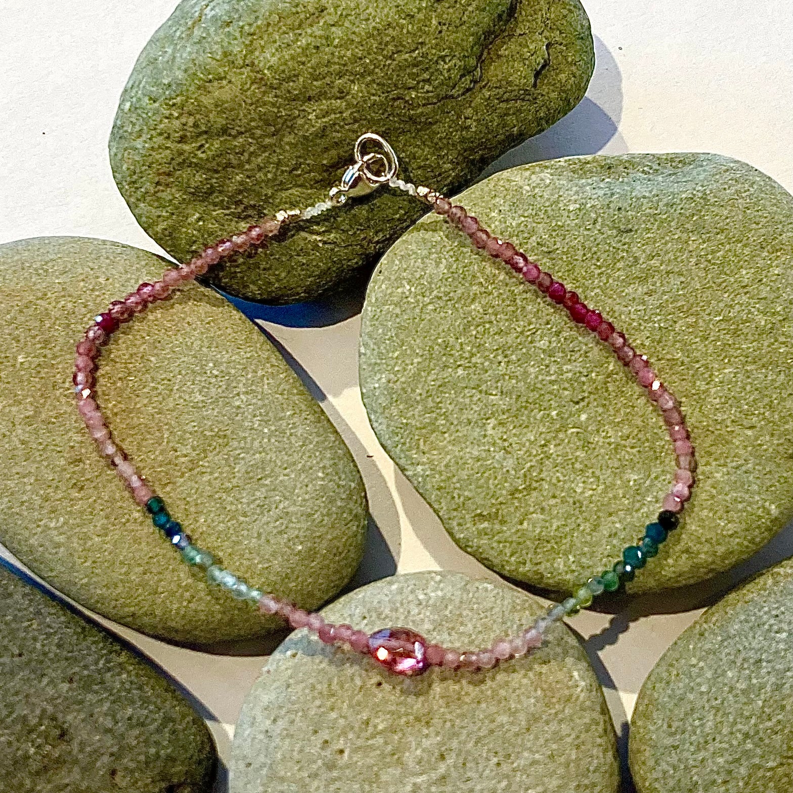 The focal point of each bracelet is a larger faceted tourmaline; either a faceted barrel shape, 5mm faceted egg shape, or (just in 7") 9mm faceted egg shape. Clasps are sterling silver.