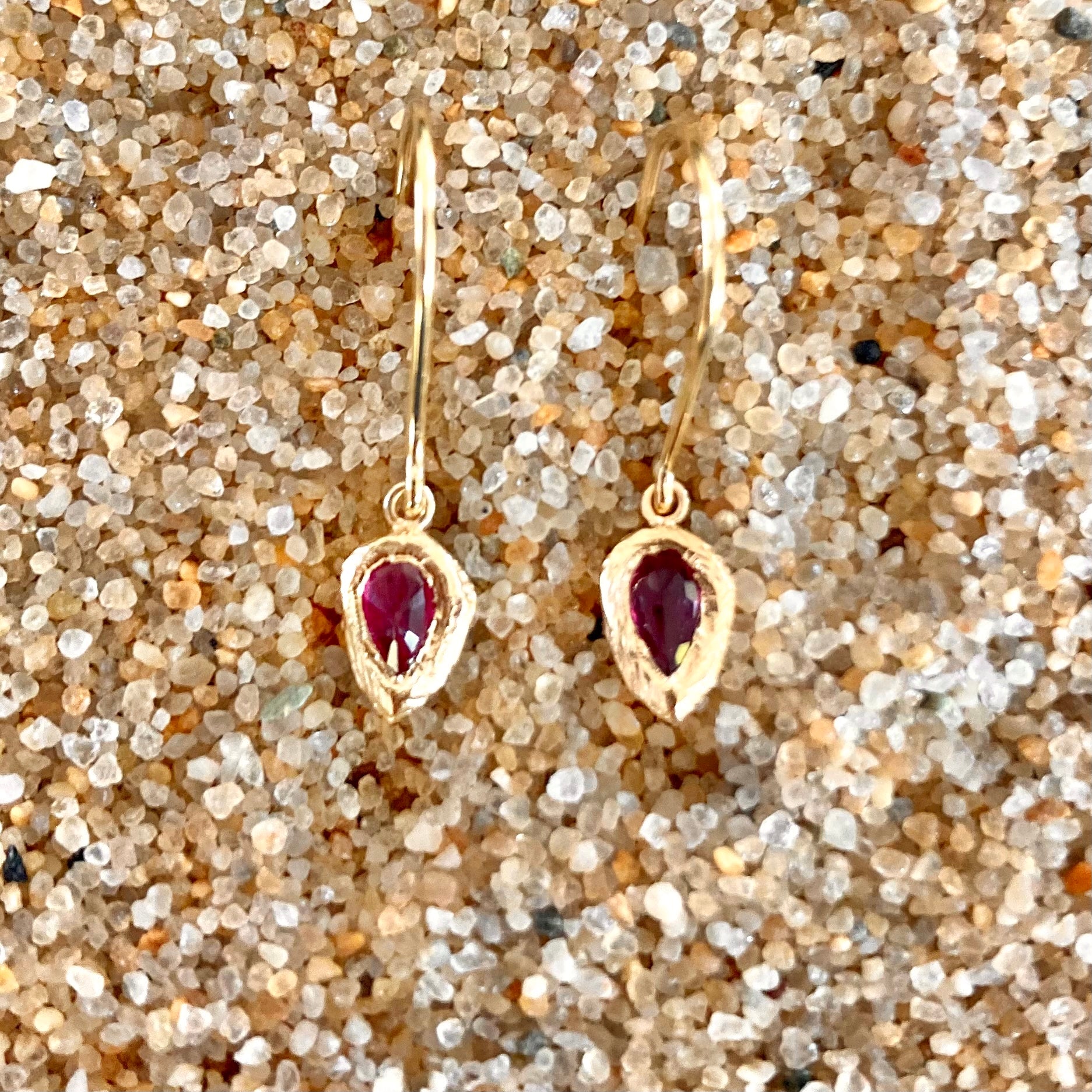 Teardrop shaped faceted precious stones (.7 TCW per pair) is set within a hand carved 18K gold frame and freely suspended from a French hook wire with silicone backings for security.