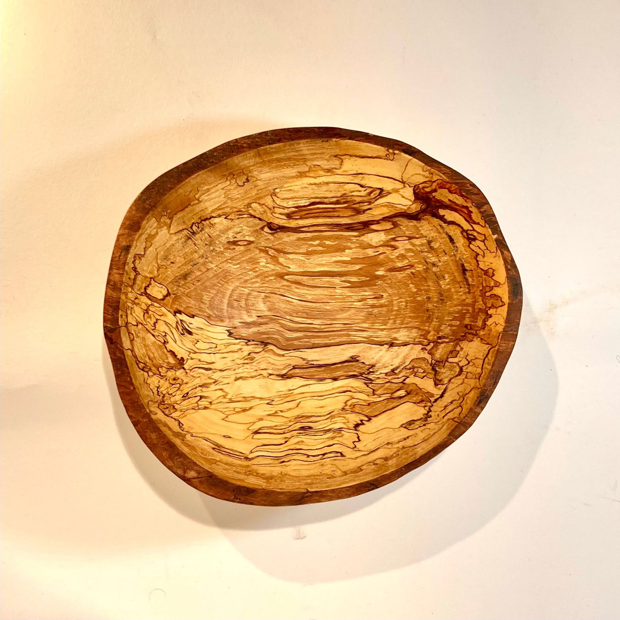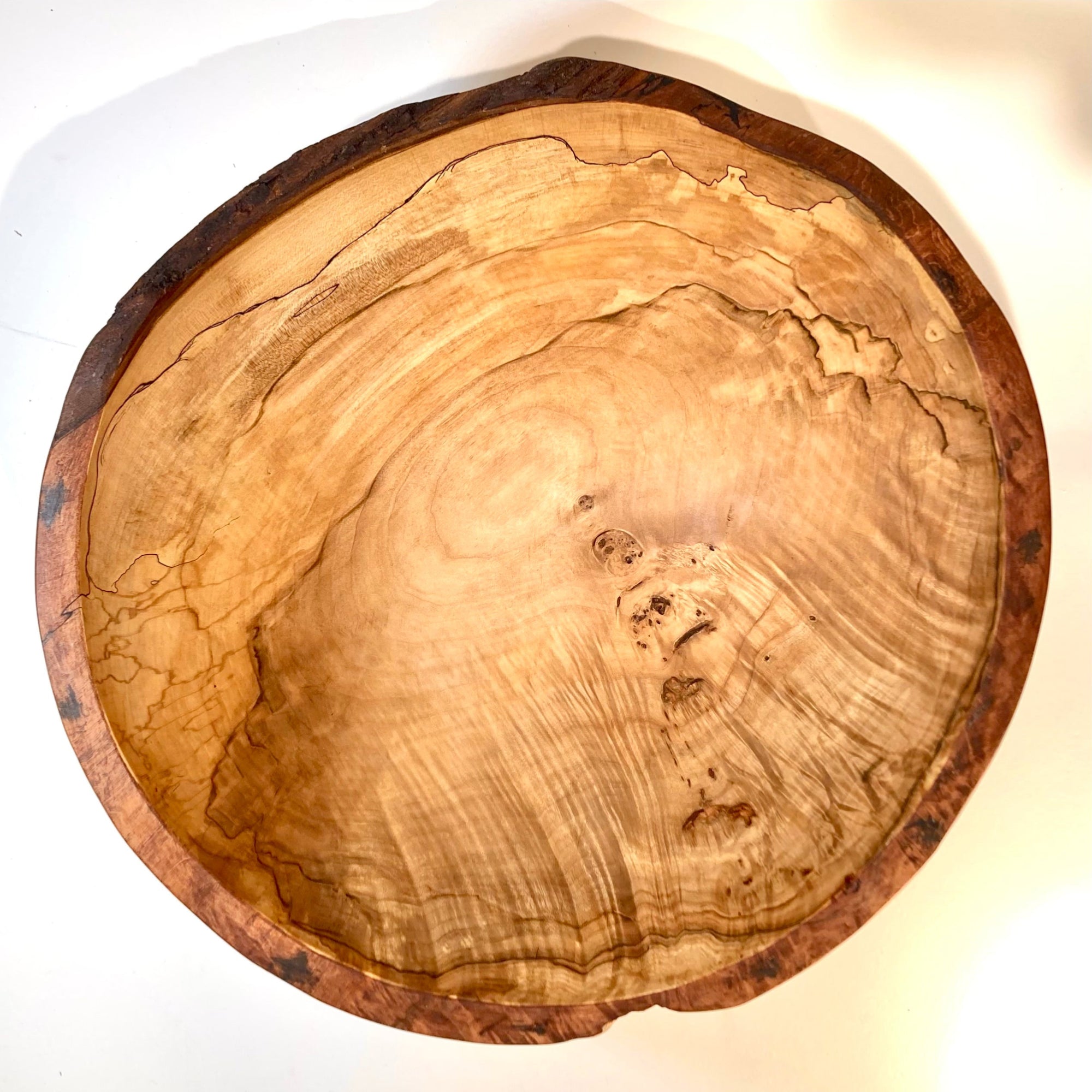 When maple trees are felled by storms or age they begin decaying, creating "spalting" or complex patterns of darkened lines and patterns within the grain. The maker collects these naturally beautiful pieces of wood where he lives in Western Massachusetts and turns them on a lathe of his own design, creating incredibly beautiful, functional bowls suitable for everyday use and centerpiece display.