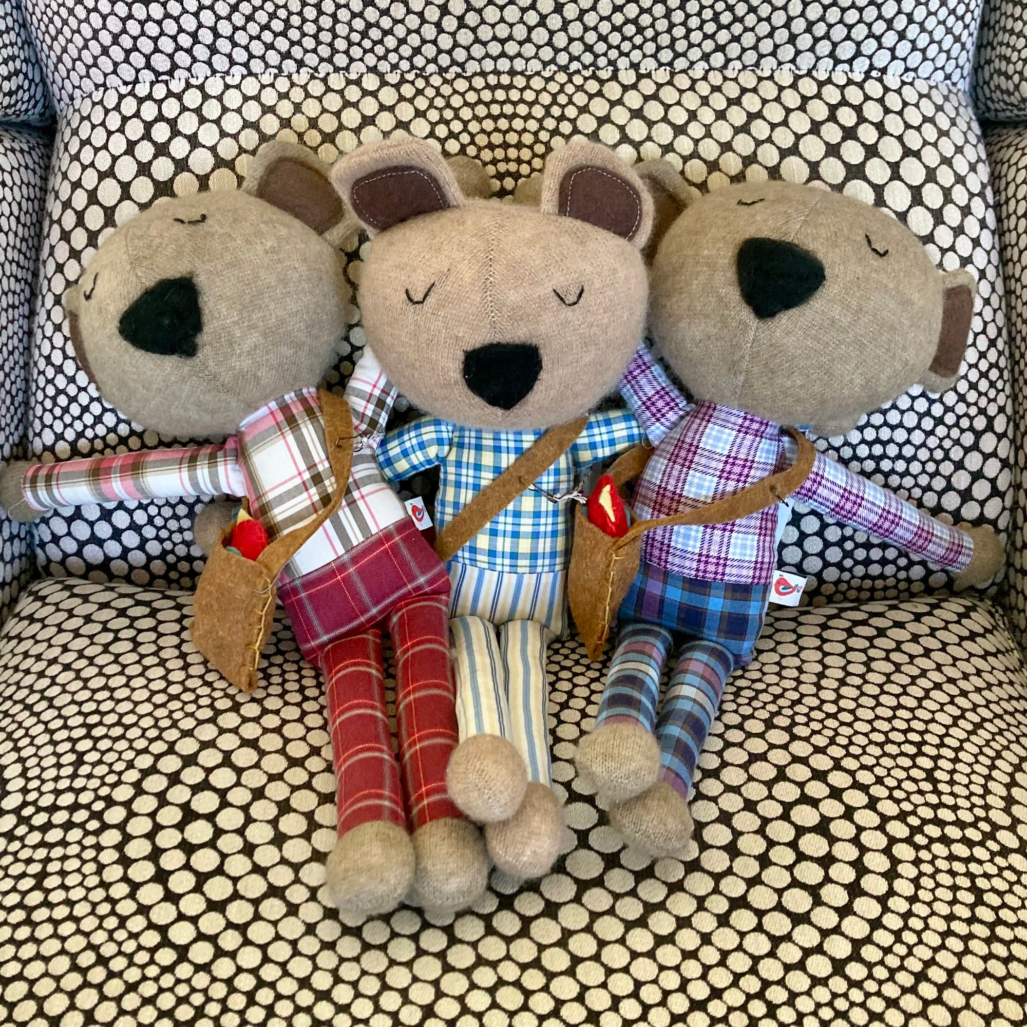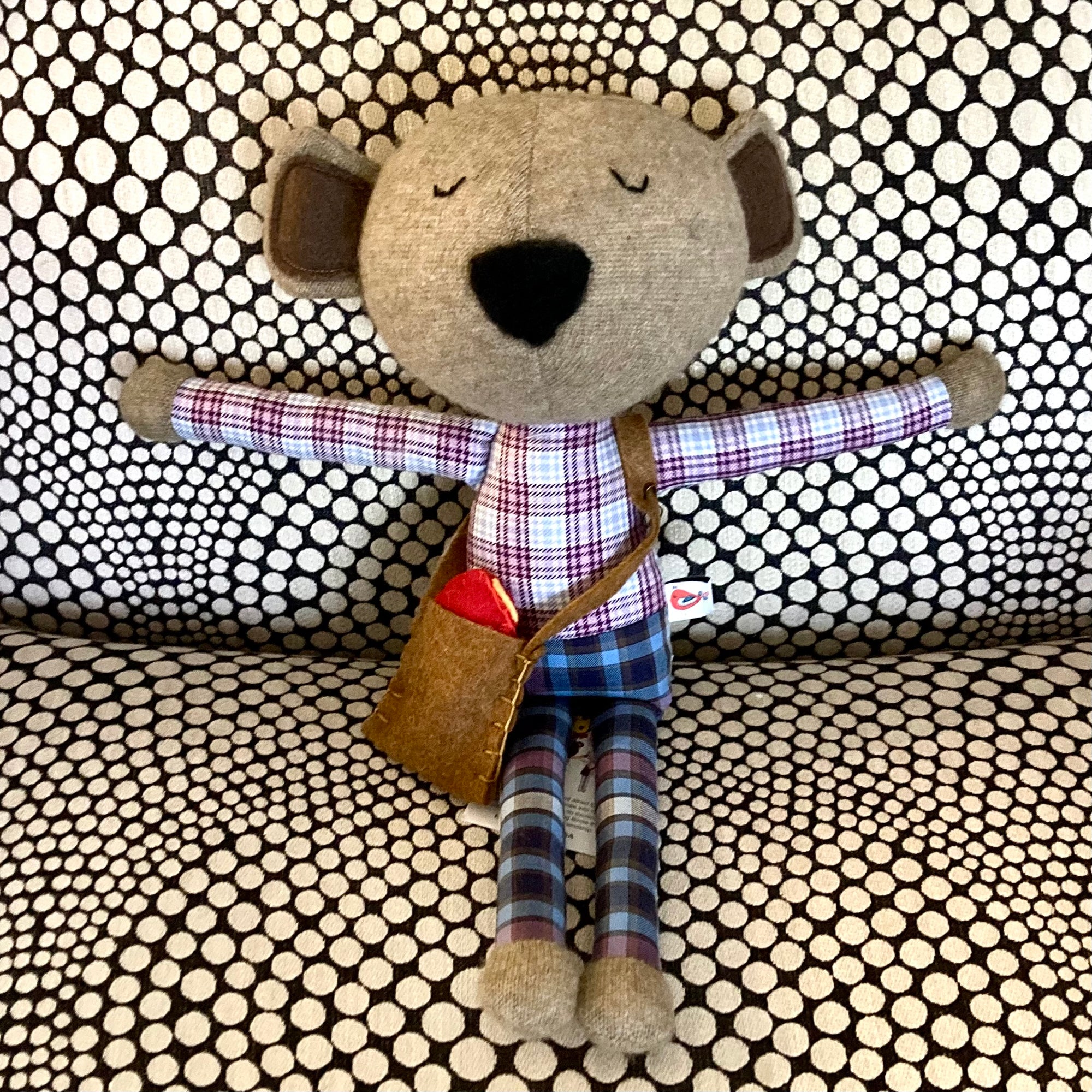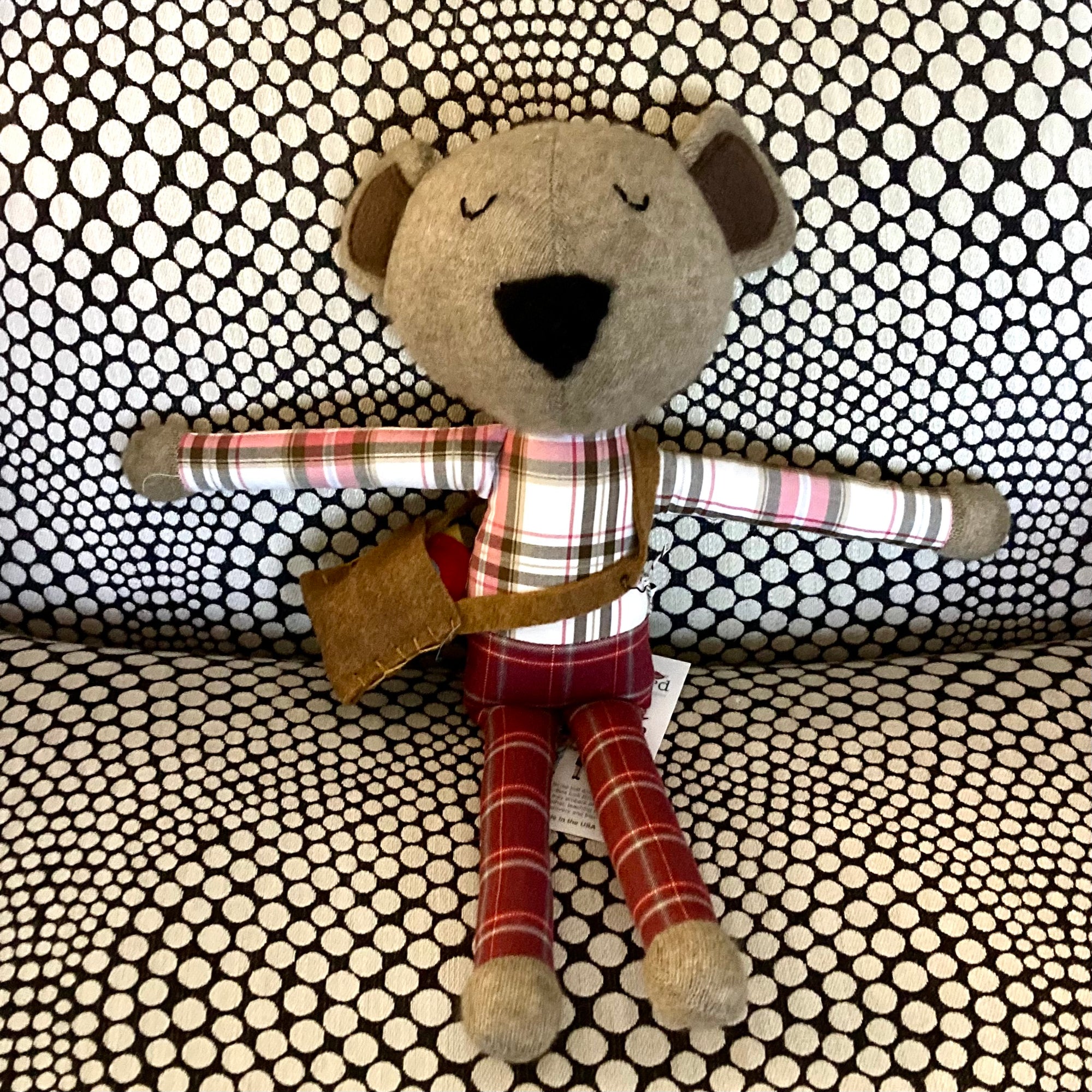 These adorable bears are covered with gently used, cleaned and upcycled clothing; the bodies are covered in highly patterned cotton shirting fabric, and the head is oh-so-soft cashmere sweaters.