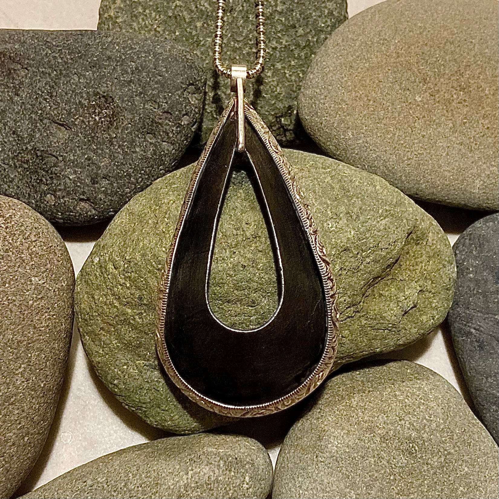 An open and curved teardrop of darkened steel is set within a frame of delicately decorated sterling silver, creating a fascinating contrast of metals, shapes, and textures.