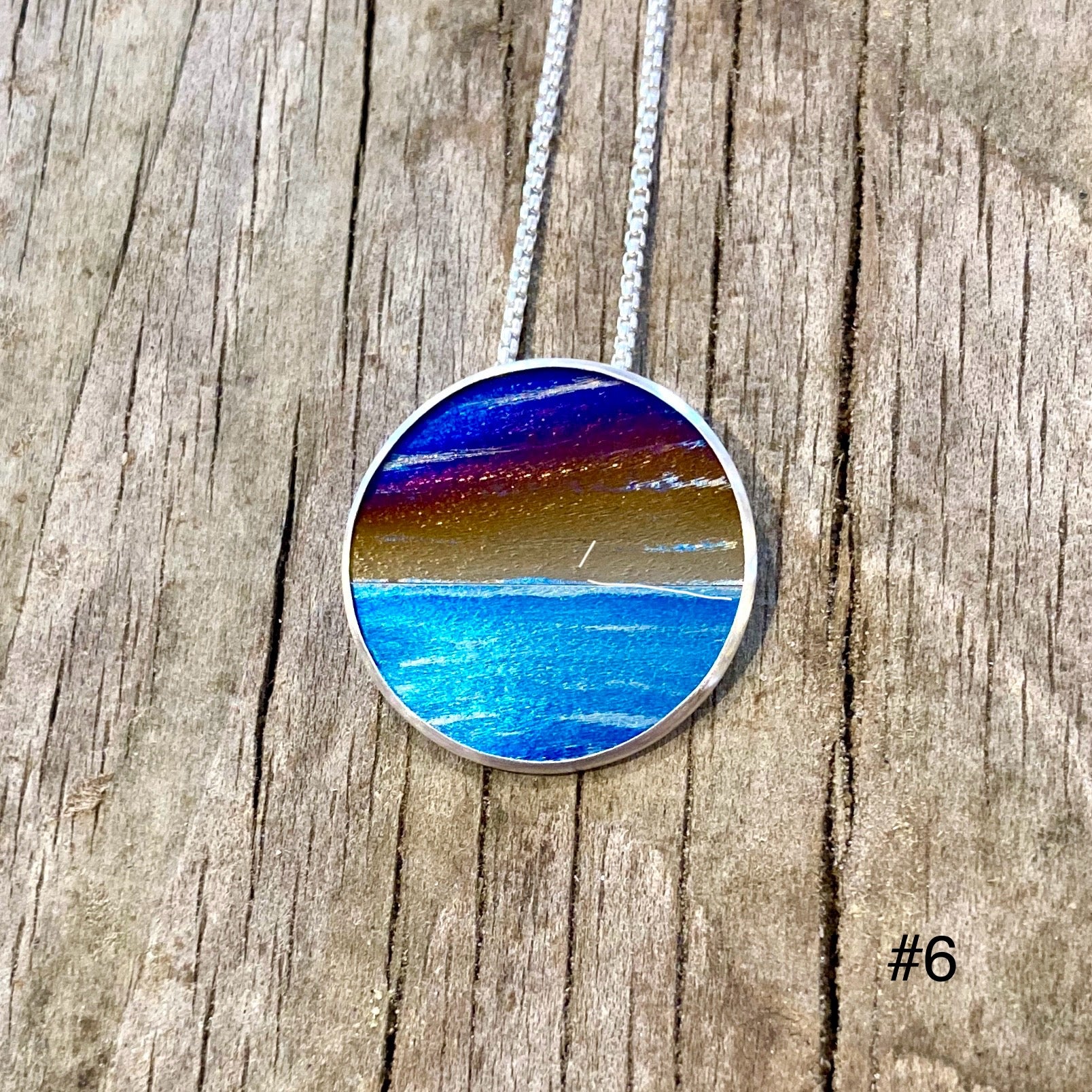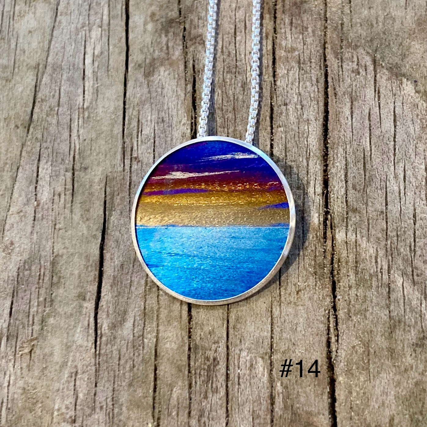 Titanium is carefully flame treated and etched to create a one of a kind "beach sunset" scene, then set into a sterling silver frame and suspended from an 18" sterling silver box chain. No two are ever alike - the necklaces shown here are the ones in stock in the store and images are updated as new deliveries arrive.