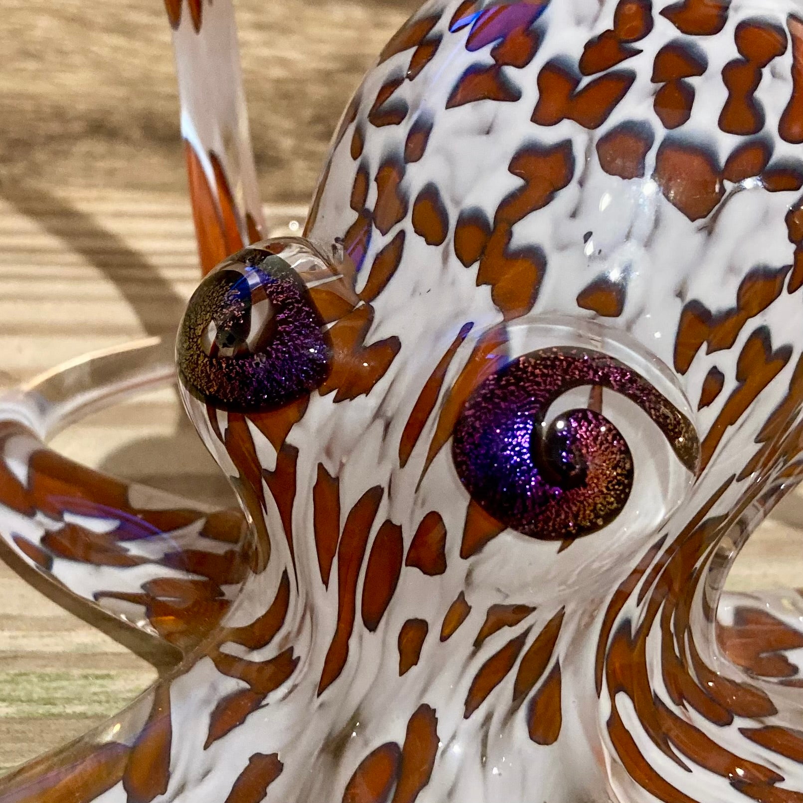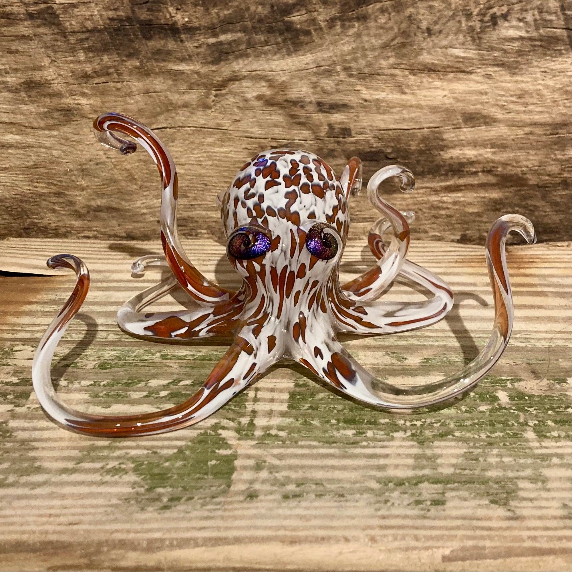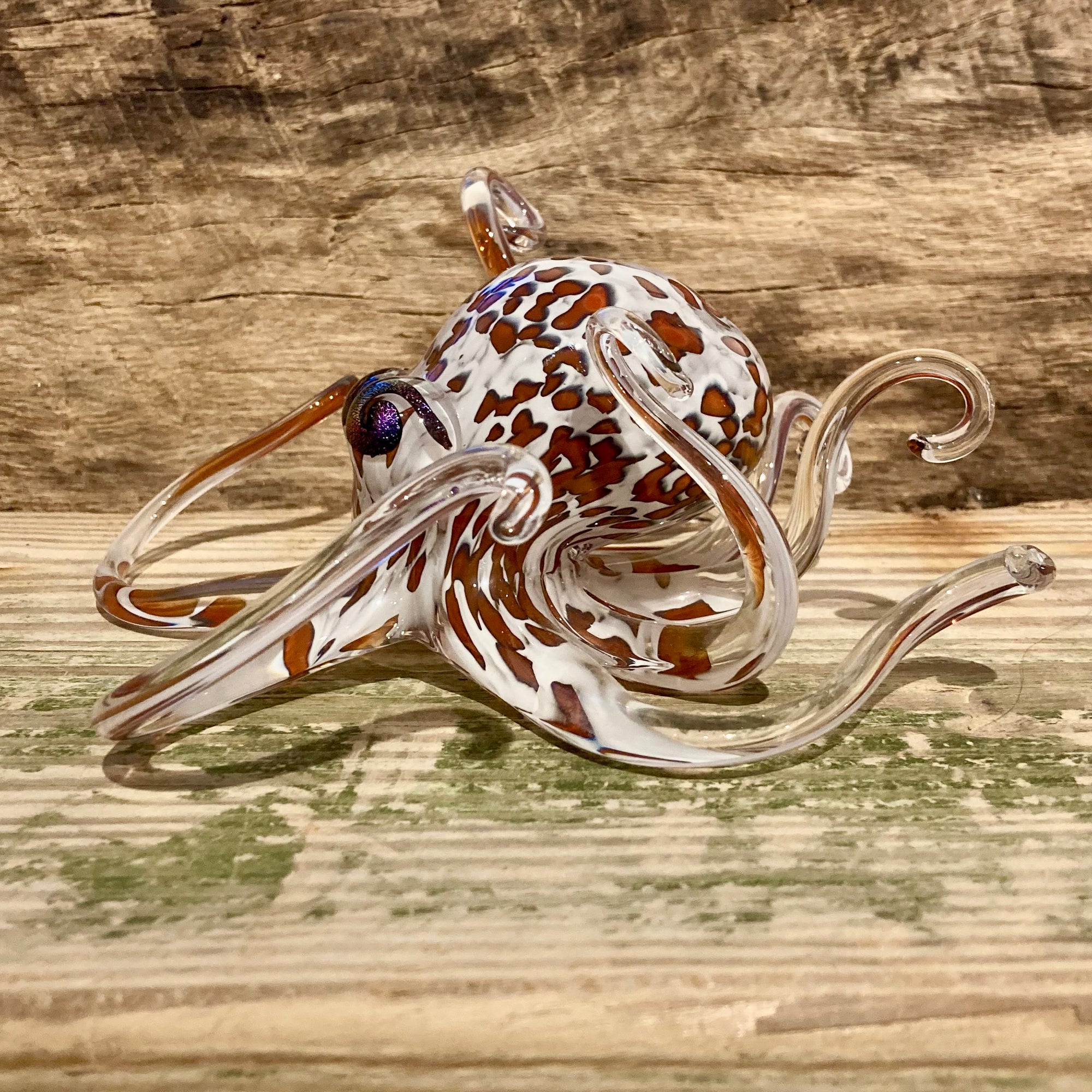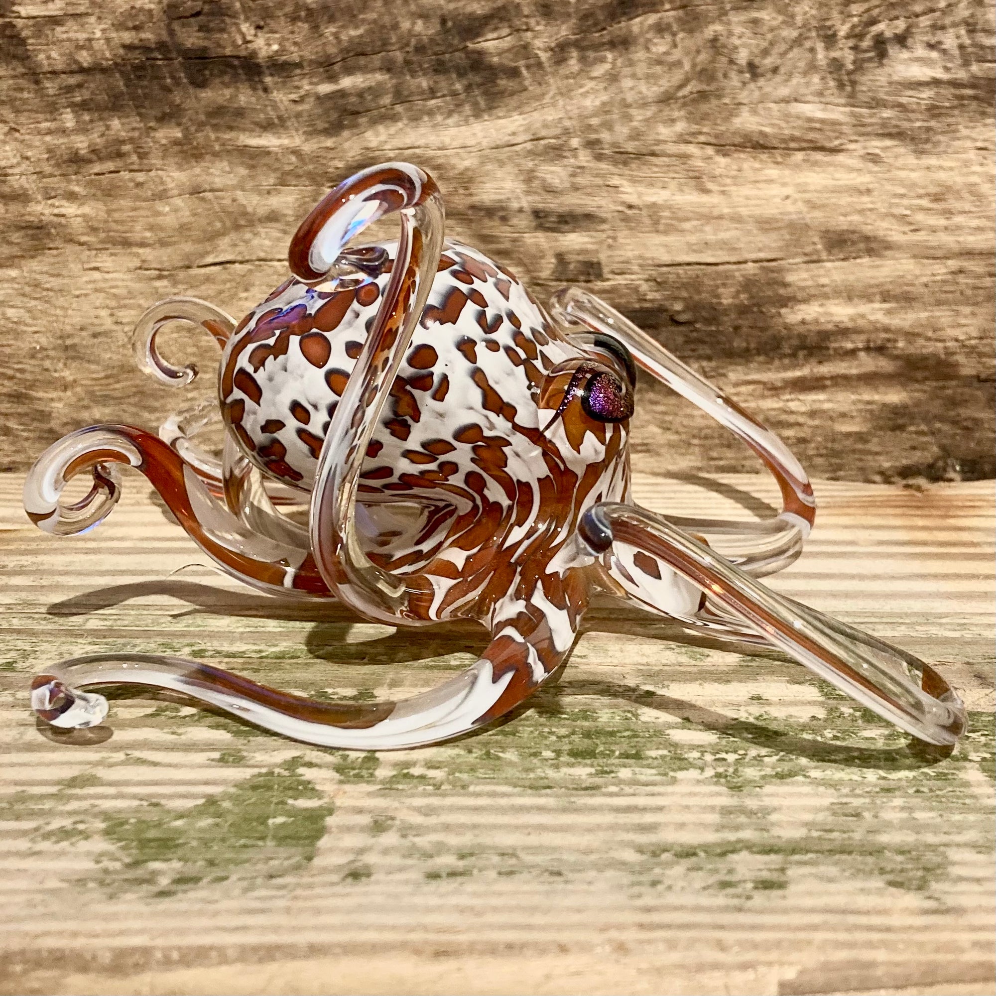 Earth tone and black spots run through this gorgeous piece against an opaline white background, an extraordinarily lifelike combination of colors that makes this octopus come to life. The glittering dichroic glass eyes makes this octopus seem ready to crawl away at a moment's notice.