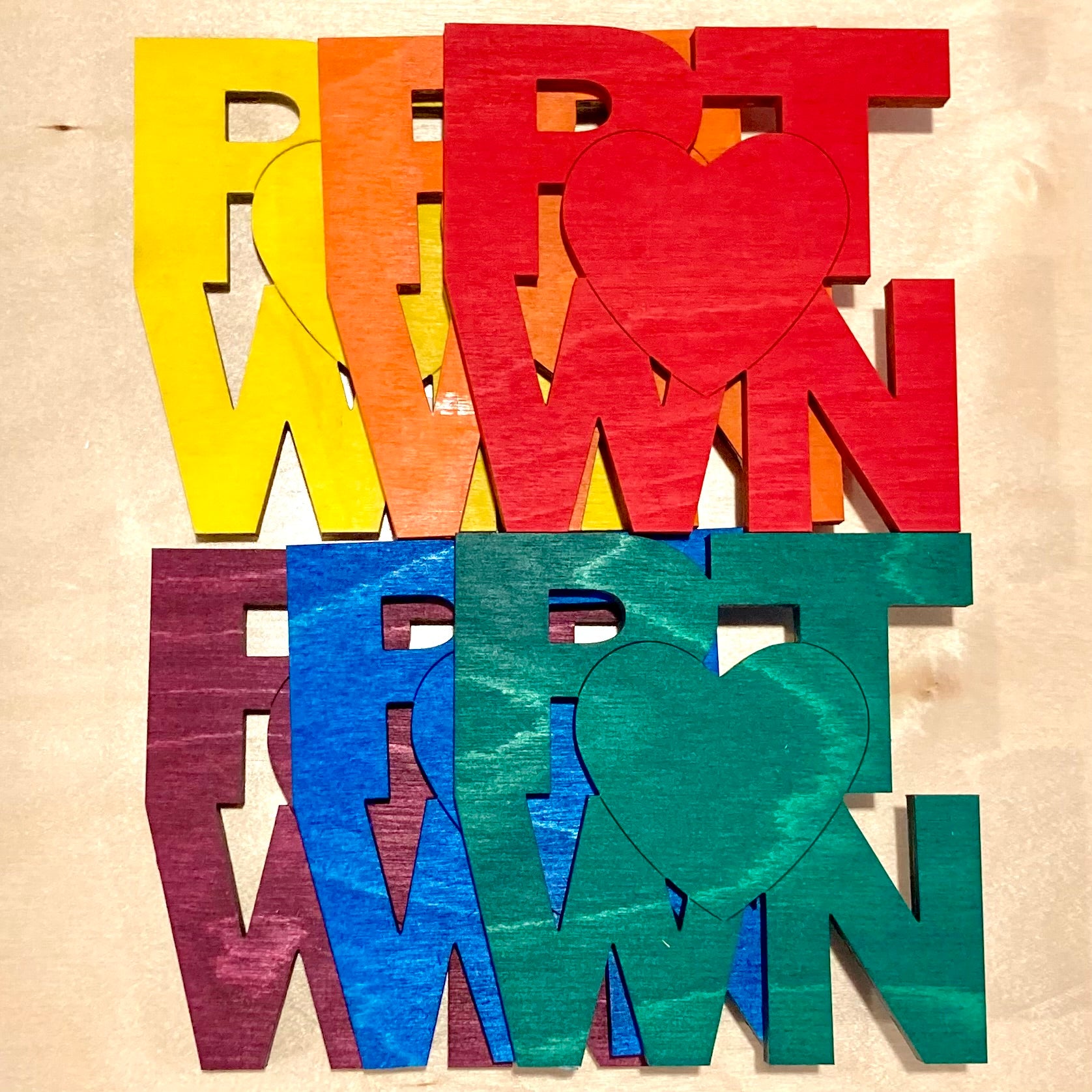 Laser cut, sustainably harvested oak is stained in the 6 classic rainbow colors, with each color raising $1 for different organizations doing important work in the world, Perfect as coasters but also great as Christmas ornaments - just put some string through the hole in the P. Buy them individually for $6.95 each, or any 6 for $39.95 (discount automatically applied at checkout).